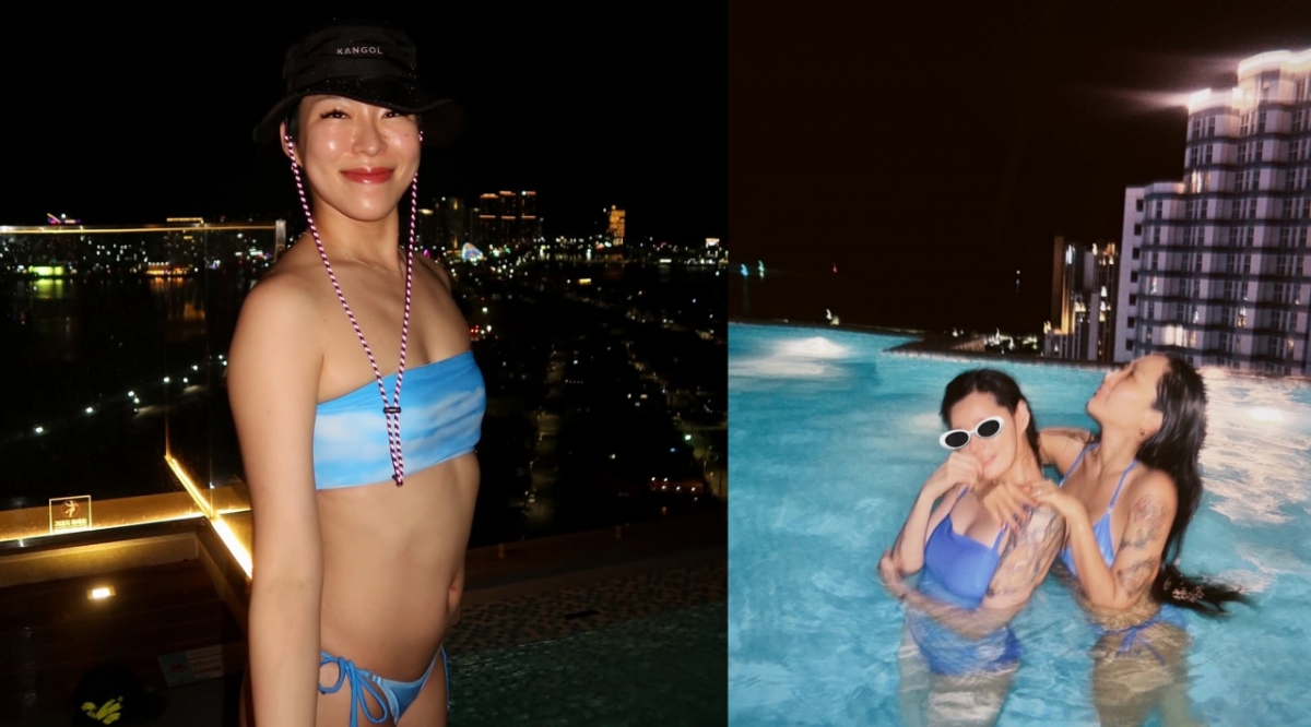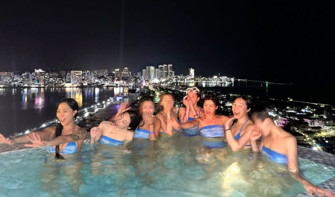 효진초이는 호텔 야외에서 비키니를 입고 포즈를 취하고 있으며 범접 멤버들 모두 똑같은 비키니를 입고 여행을 즐기고 있어 눈길을 끈다.