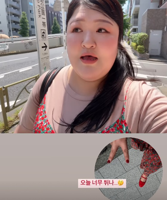 현재 일본에서 자취 중인 이국주는 빨간색 원피스를 입고 거리를 거닐고 있다.
