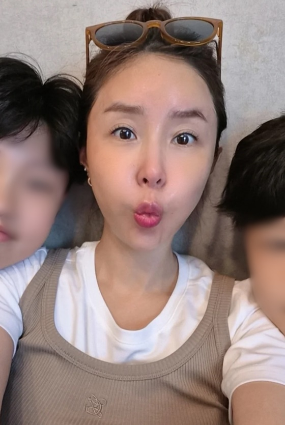 그는 브이 포즈를 취한 조카들을 사이에서 볼에 바람을 넣은 표정을 짓고 있다.