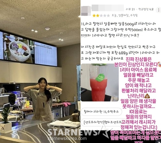 캡처 사진에 따르면 노을 카페에서 배달로 1L 수박주스를 주문한 이 고객은 "1L라고 팔면서 얼음 빼면 500g이 사라진다고 답변을 들었는데 그럴 거면 수박 500ml 주스라고 팔아야지 1리터라고 팔면 사기 아니냐. 저 사진은 배달 오자마자 한 입도 안 마시고 찍은 거다. 그램 재보니까 병 포함 688g이던데 1리터라고 하고 파는 게 맞는지 궁금하다"라며 별점 5점 만점 중 2점을 매겼다.