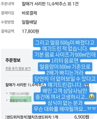 또한 그는 "그리고 얼음 500g 빠졌다고 얘기드린 적 없다. 기본 음료 사이즈가 500ml인데 1리터 음료면 얼음 양이 500ml 기준으로 2배가 빠지는 거라 당연히 더 없어 보일 수 있다고 얘기드린 거다. 배달 어플 상담사만 중간에 껴서 고생하시고 상식이 없는 분과 무슨 대화를 해야 될까요"라고 격앙된 어조로 얘기했다.