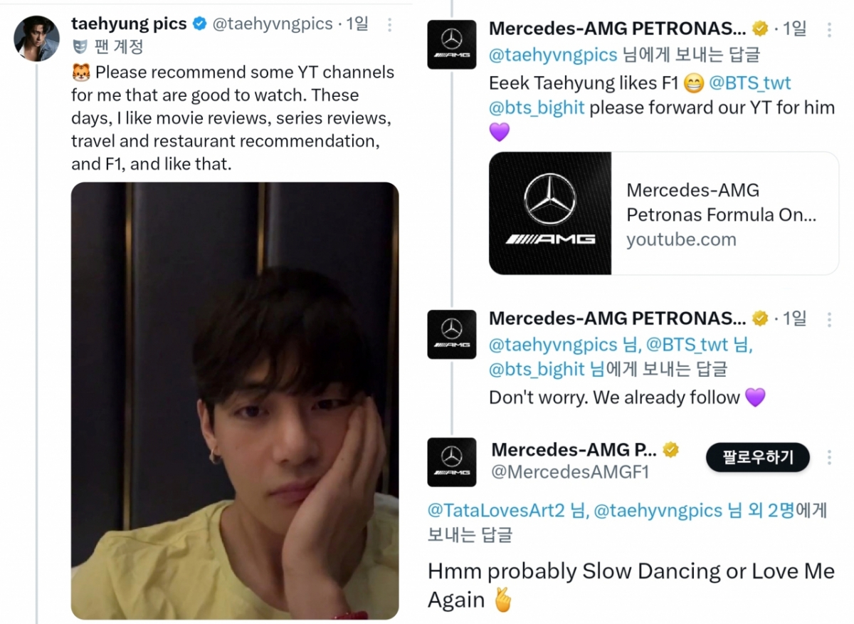 이어 메르세데스-AMG는 뷔의 스포티파이 페이지를 이미 팔로우하고 있으며 좋아하는 곡은 '슬로우 댄싱'과 '러브 미 어게인'이라고 밝혔다.