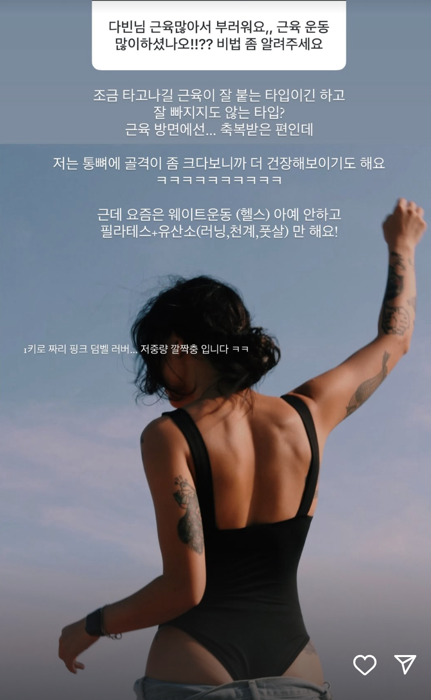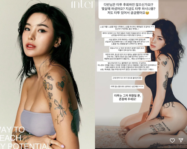또한 "없는 것보다야 다소 불편함은 감수해야 하는 것 같아요"라며 "근데 만약 다시 하기 전으로 돌아간다면 타투 없는 몸으로도 살아보고 싶긴 해요"라고 덧붙였다.