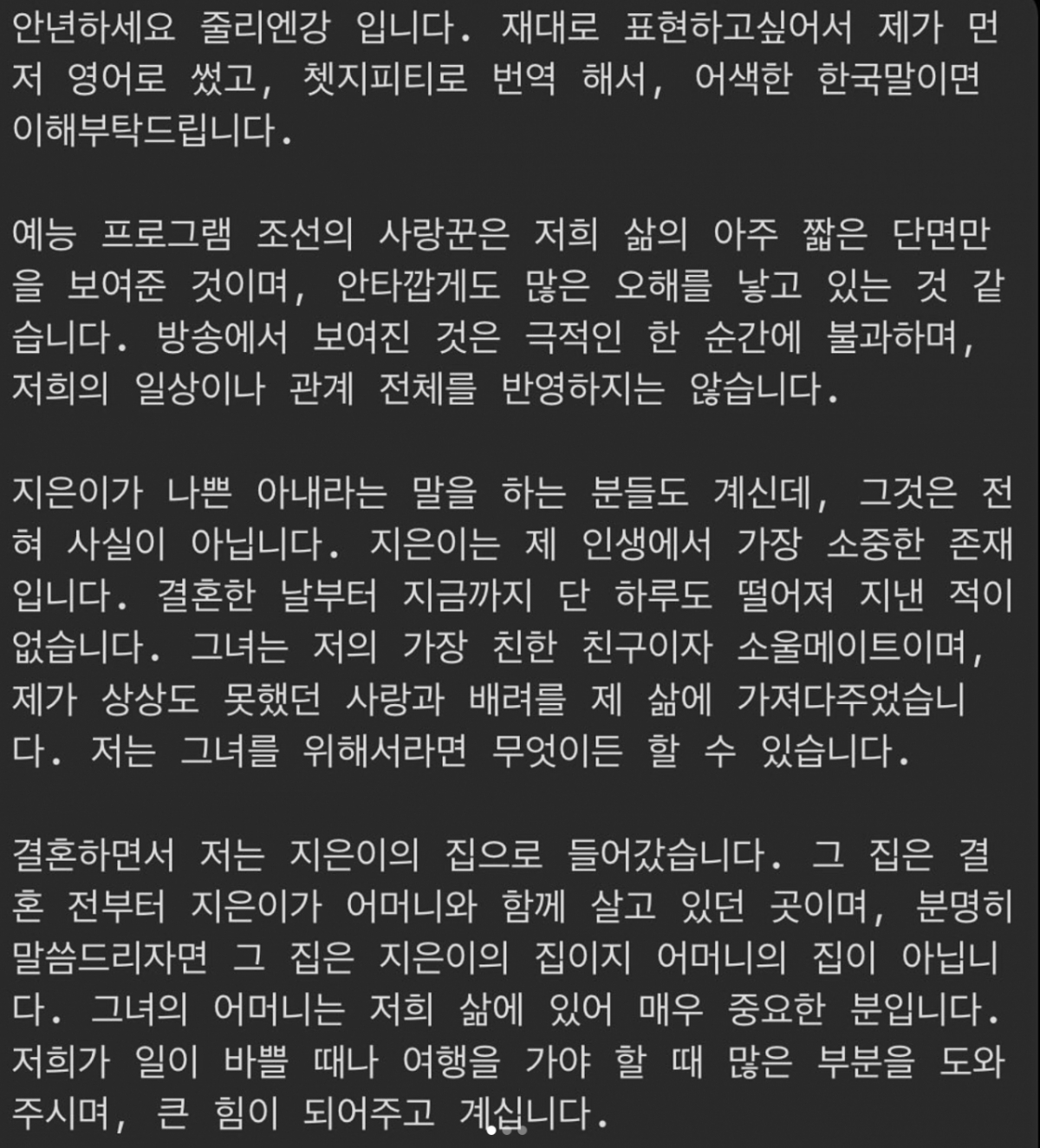 줄리엔강은 31일 챗GPT로 번역해 직접 작성한 글을 통해 "'조선의 사랑꾼' 속 모습은 저희 삶의 아주 짧은 단면만 보여준 것이며 안타깝게도 오해를 낳고 있는 것 같다. 방송에서 보여진 건 극적인 한 순간에 불과하며 저희의 일상이나 관계 전체를 반영하지 않는다"라며 "지은이가 나쁜 아내라는 말을 하는 분도 계신데 전혀 사실이 아니다. 지은이는 제 인생에서 가장 소중한 존재이고 결혼한 날부터 지금까지 단 하루도 떨어져 지낸 적이 없다. 가장 친한 친구이자 소울메이트며 제가 상상도 못했던 사랑과 배려를 제 삶에 가져다줬다"라고 강조했다.