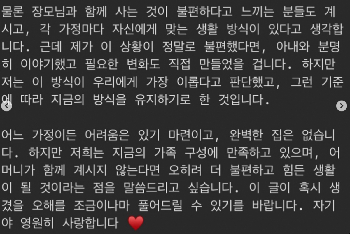 이어 "물론 장모님과 함께 사는 것이 불편하다고 느끼는 분들도 계시고 각 가정마다 자신에게 맞는 생활 방식이 있다고 생각한다. 근데 제가 이 상황이 정말 불편했다면 아내와 분몀히 이야기했고 필요한 변화도 직접 만들었을 것"이라며 "하지만 저는 이 방식이 우리에게 가장 이롭다고 판단했고 그런 기준에 따라 지금의 방식을 유지하기로 한 것"이라고 강조했다.