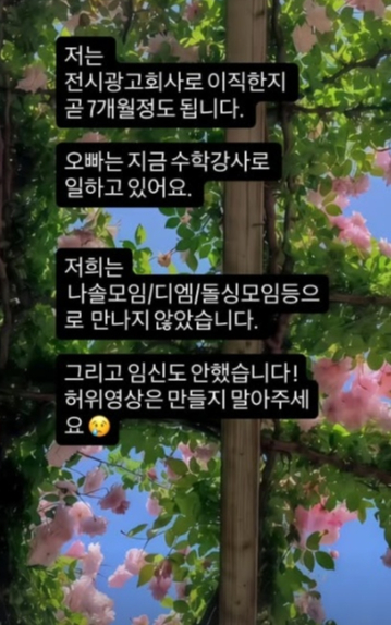 이후 22기 현숙은 "저는 전시 광고회사로 이직한지 곧 7개월 됩니다. 오빠(16기 광수)는 지금 수학강사로 일하고 있어요"라고 밝혔다. 이어 "저희는 나솔모임/디엠/돌싱모임 등으로 만나지 않았습니다. 그리고 임신도 안했습니다"라며 "허위 영상은 만들지 말아주세요"라고 전했다.