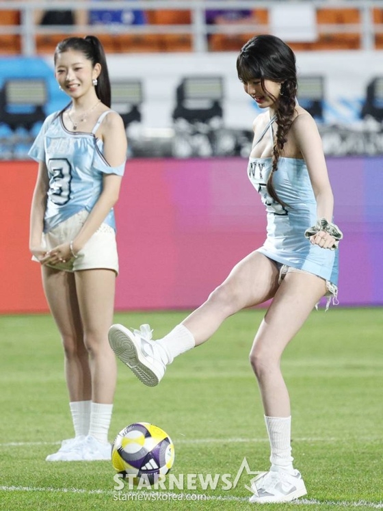 경기장에 등장한 아이브는 여신 비주얼로 눈길을 끌었다. 그중 장원영은 남다른 패션 센스를 자랑했다. 그는 민소매 미니 원피스와 초미니 핫팬츠를 입었다. 각기 다른 스타일의 두 착장을 완벽히 소화하며, 아이브 내 '패션 퀸'의 존재감을 드러냈다.