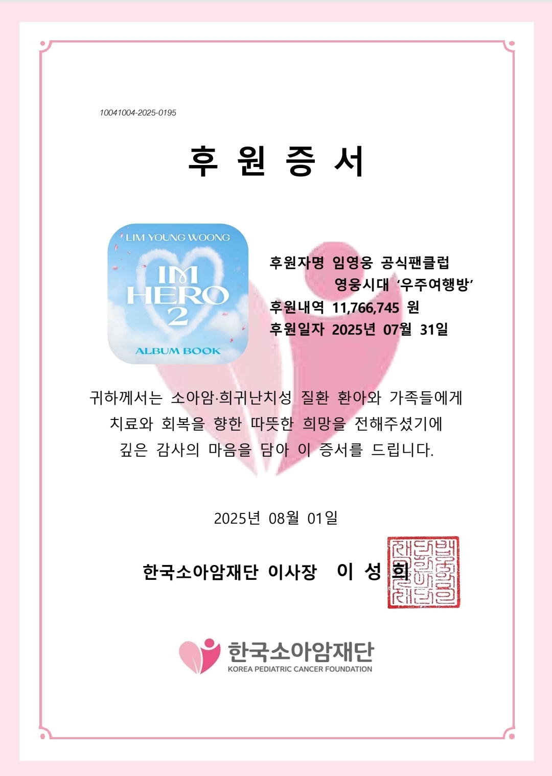 임영웅 팬클럽 영웅시대 우주여행방은 8월 8일 임영웅 데뷔 9주년을 맞아 7월 31일 한국소아암재단에 1176만 6745원을 기부했다.