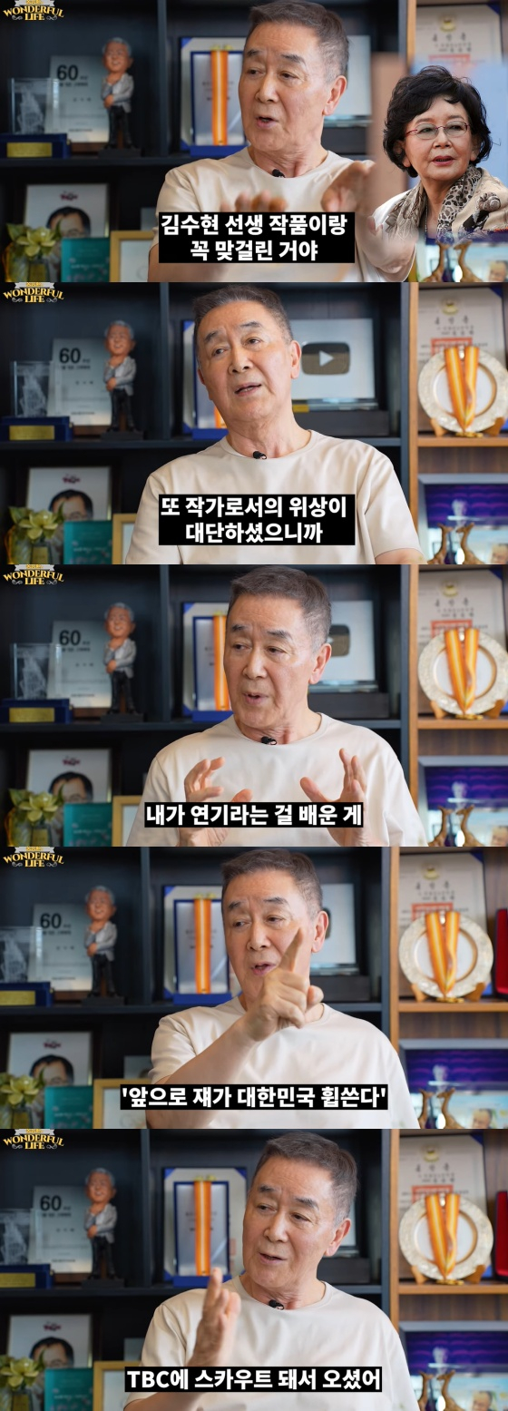 이어 "배우라는 게 감정을 넣는 연기는 쉽다. 성질내고 슬프고 이런 건 쉬운데 표정 없이 담담하기가 어려운데 그걸 그분에게 배웠다. 내가 TBC에서 내가 빵 떴을 때 김수현 선생이 TV를 딱 보면서 '앞으로 쟤가 대한민국 휩쓴다'고 했다더라"고 전했다.