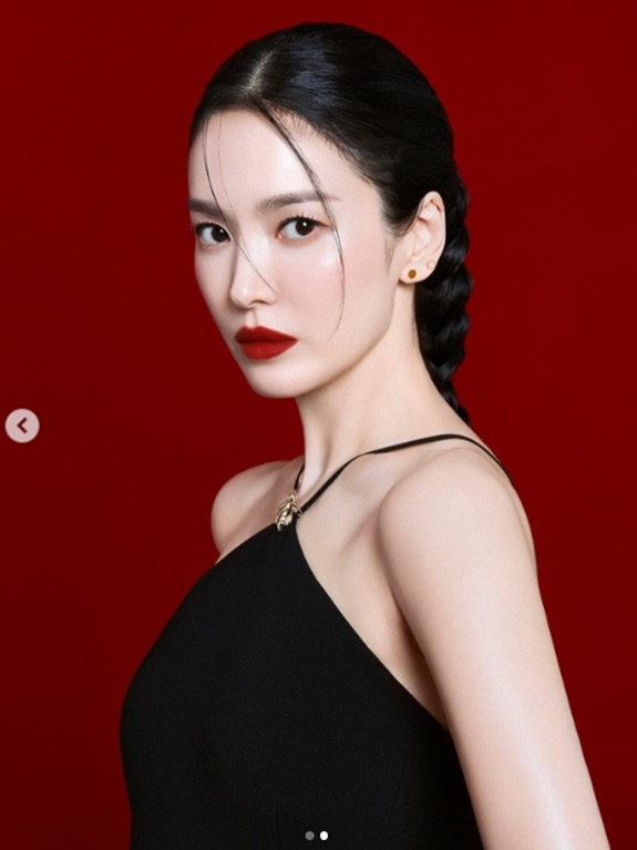 공개된 사진 속 송혜교는 버건디 배경 앞에서 블랙 의상을 입고 붉은색 립스틱을 바른채 카리스마 넘치는 표정으로 카메라를 응시하고 있다.