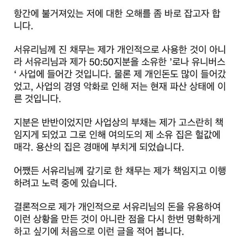 이어 "지분은 반반이었지만 사업상의 부채는 제가 고스란히 책임지게 되었고 그로 인해 여의도 제 소유 집은 헐값에 매각. 용산 집은 경매에 부치게 되었다"라고 전했다.