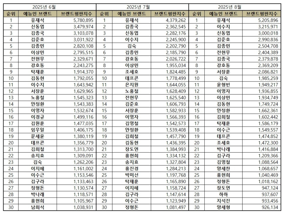 2025년 8월 예능방송인 브랜드평판 30위 순위는 유재석, 이수지, 신동엽, 김준호, 김종민, 전현무, 김종국, 강호동, 서장훈, 김숙, 윤형빈, 이영자, 이상민, 김동현, 안정환, 김희철, 탁재훈, 이수근, 데프콘, 조세호, 박나래, 김구라, 김영철, 양세찬, 홍현희, 정형돈, 장도연, 하하, 지석진, 양세형 순으로 분석됐다.