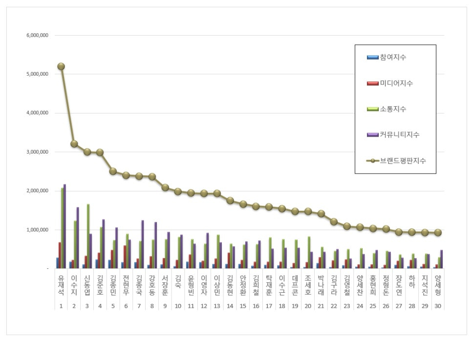 예능방송인 브랜드평판 1위를 기록한 유재석 브랜드는 참여지수 281,561 미디어지수 681,845 소통지수 2,077,615 커뮤니티지수 2,164,875가 되면서 브랜드평판지수 5,205,896으로 분석됐다. 지난 7월 브랜드평판지수 4,379,262와 비교해보면 18.88% 상승했다.