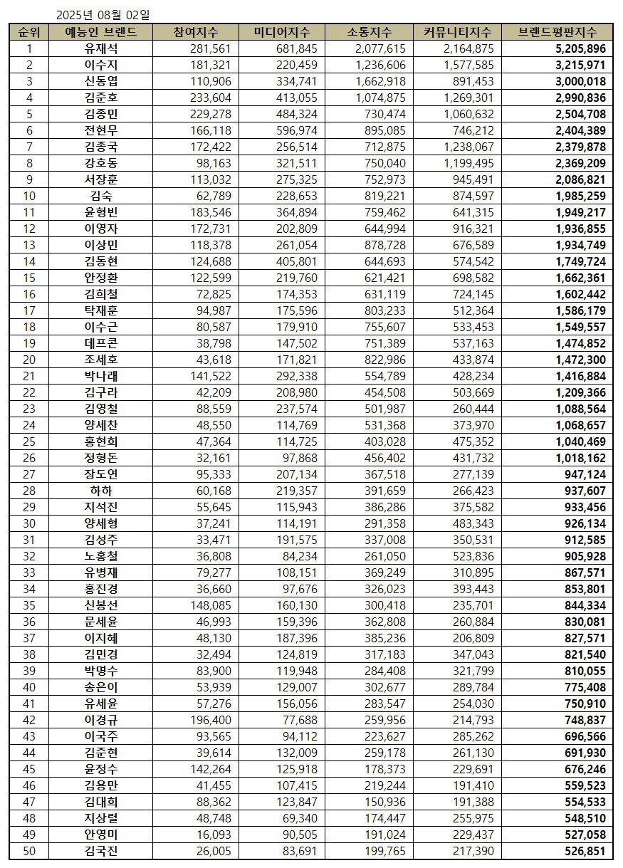 한국기업평판연구소는 2025년 7월 2일부터 2025년 8월 2일까지의 예능방송인 50명의 브랜드 빅데이터 70,377,479개를 분석하여 소비자들의 예능 방송인 브랜드 참여량, 미디어량과 소비자의 참여와 소통량, 소셜에서의 대화량을 측정했다. 지난 7월 예능방송인 브랜드 빅데이터 66,418,810개와 비교하면 5.96% 증가했다.