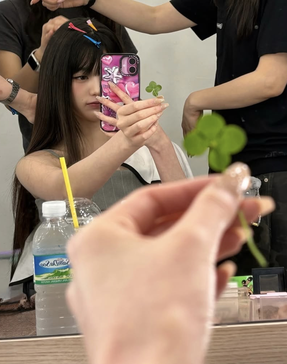 공개된 사진 속 장원영은 헤어·메이크업을 받는 중 네잎클로버를 손에 들고 거울 셀카를 찍고 있다.