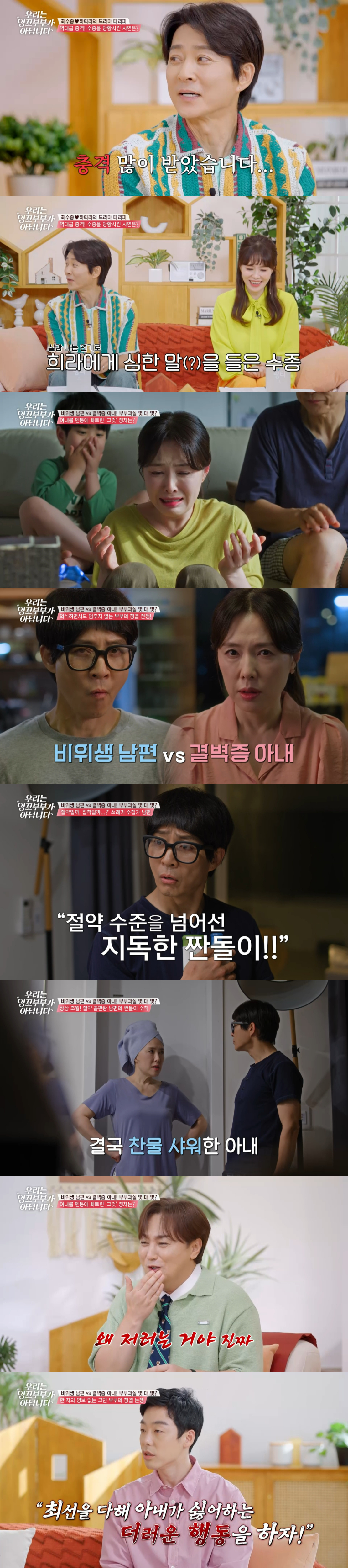 이번 회차의 대본을 받고 '역대급 충격'을 받았다고 고백한 최수종은 대본을 준비하는 과정에서부터 하희라의 헛구역질을 부르고, "아이 더러워 죽겠어" 소리까지 들었다며 귀여운 억울함을 호소한다. 이윽고 자신 역시 연기를 진행하면서 "더러워서 못 하겠네"라고 생각했다고 전해 스튜디오를 웃음바다로 만든다. 실제로 깔끔한 성격의 최수종이 결혼 초기 하희라가 정리를 잘 안 한다는 부분을 폭로하는데, 자신은 잔소리는 안 하고 대신 다 치워준다며 사랑꾼 남편 모습을 보여 눈길을 끌기도. 또한 재연 드라마를 찍으며 경상도 사투리에 첫 도전했다는 하희라의 걱정 가득한 모습이 비치는 반면 경상도 출신인 최수종은 연기하며 200% 즐겼다고 밝힌다. 이에 황제성은 "본능인데 그동안 누르고 살아왔던 게 아닐까"라며 합리적 의심을 하고 이에 정신과 전문의 김지용이 동조하며 수라 부부가 펼칠 고민 부부 연기에 대해 궁금증이 증폭된다.
