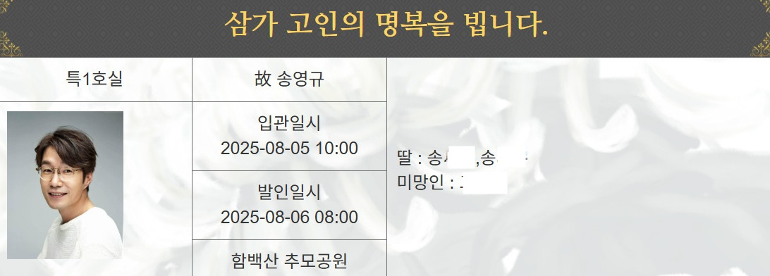 송영규의 빈소는 용인시 다보스 병원장례식장 특1호실에 마련됐다. 공식 홈페이지에 기재된 영정사진은 2017년, 이때 몸담았던 소속사에서 촬영했던 프로필 컷이다. 고인은 해맑은 미소를 짓고 있어 먹먹함을 더했다.