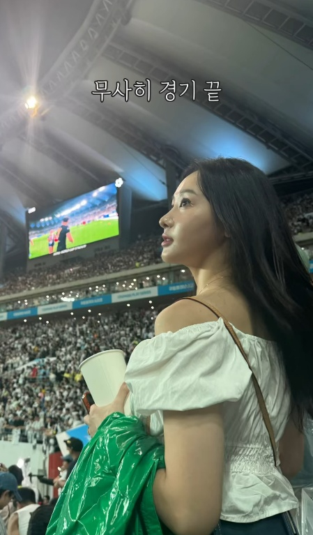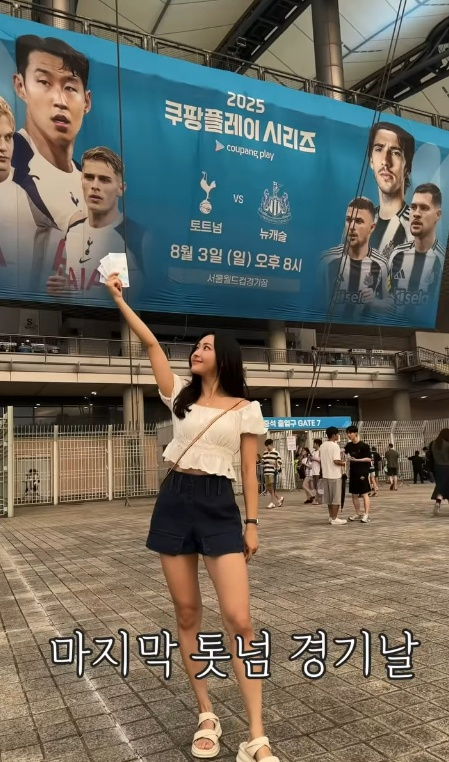 사진과 영상 속 김다영은 지난 3일 서울월드컵경기장에서 열린 2025 쿠팡플레이 시리즈 뉴캐슬 유나이티드(잉글랜드)와 친선 경기에 선발 출전한 토트넘 손흥민의 경기를 직관하러 나선 모습이었다.