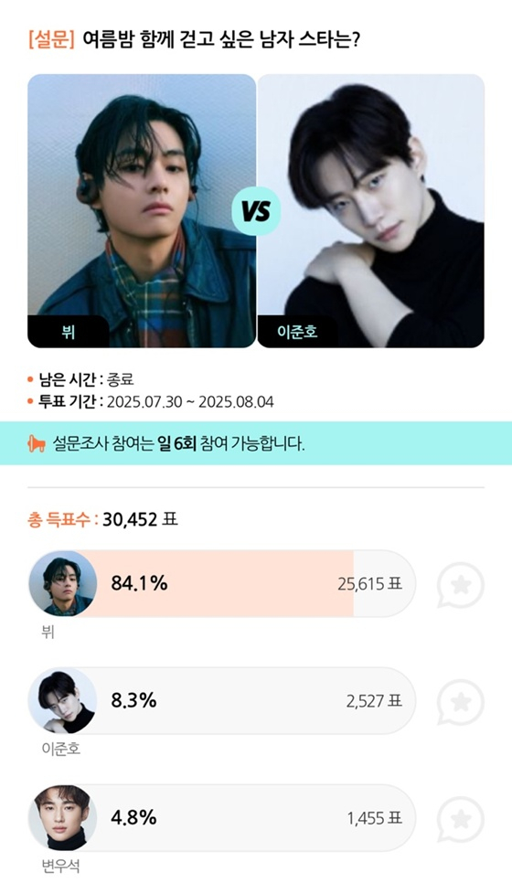 뷔는 지난 7월 30일부터 8월 4일까지 종합 엔터테인먼트 모바일 앱 스타폴(STARPOLL)에서 진행된 '여름밤 함께 걷고 싶은 남자 스타는?' 설문에서 1위에 올랐다.