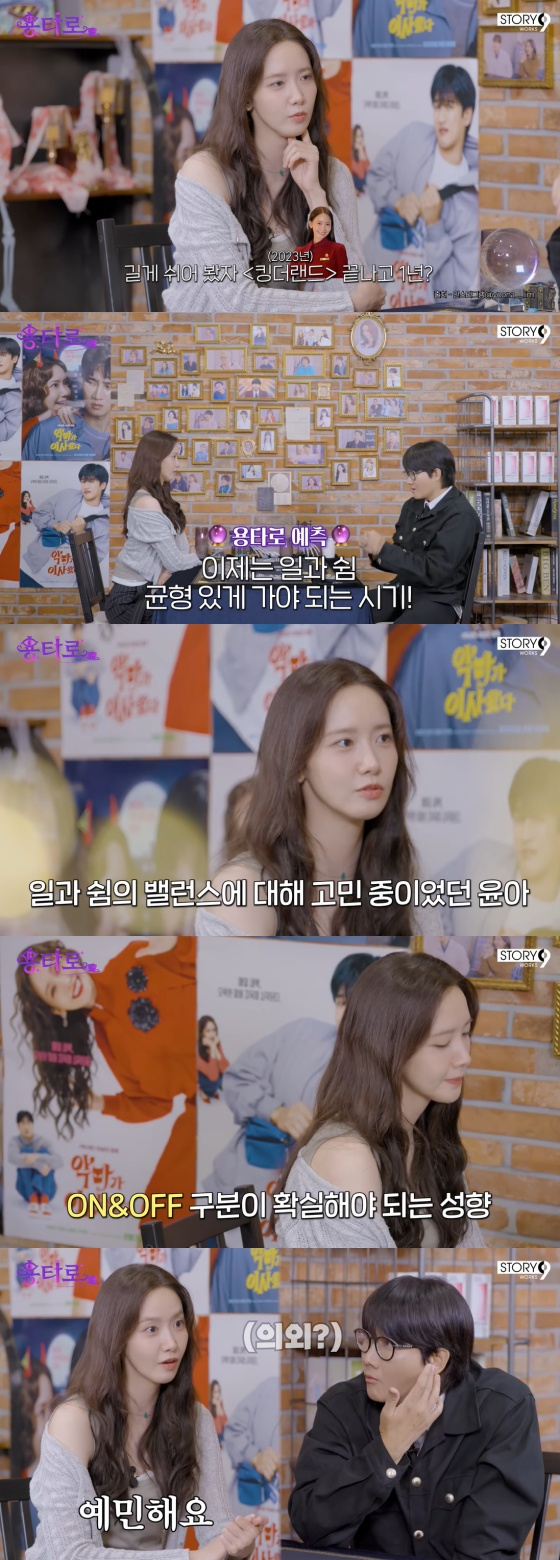 이용진은 임윤아가 뽑은 타로 카드를 보며 "이제는 일과 쉼이 균형 있게 가야 하는 시기"라며 "안 그러면 본인이 육체적으로나 정신적으로 굉장히 힘들 수 있다. 일을 많이 하면 일에 대한 정이 떨어지는 시기가 온다"고 해석했다.