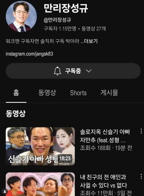 공개된 사진에는 '퇴물 장성규'에서 '만리장성규'로 수정된 유튜브 채널명이 담겨 있다.