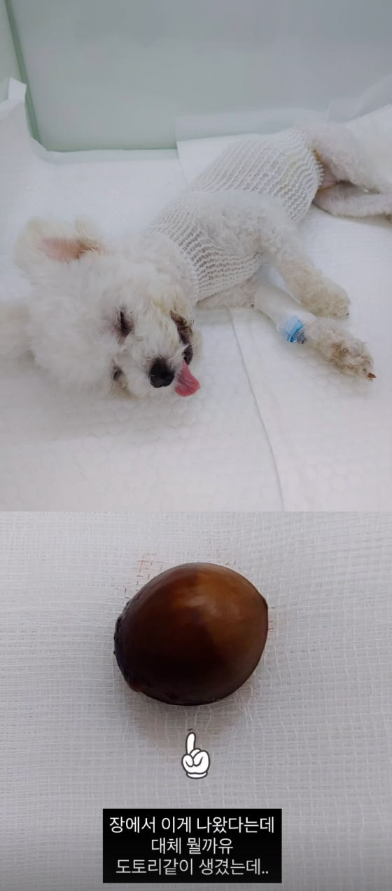 이후 미자는 "수술 잘 끝났다고 한다. 장에서 이게 나왔다는데 대체 뭘까. 도토리같이 생겼다"고 무사히 수술이 끝났음을 알리며 마취에서 덜 깬 반려견 사진을 공개했다.