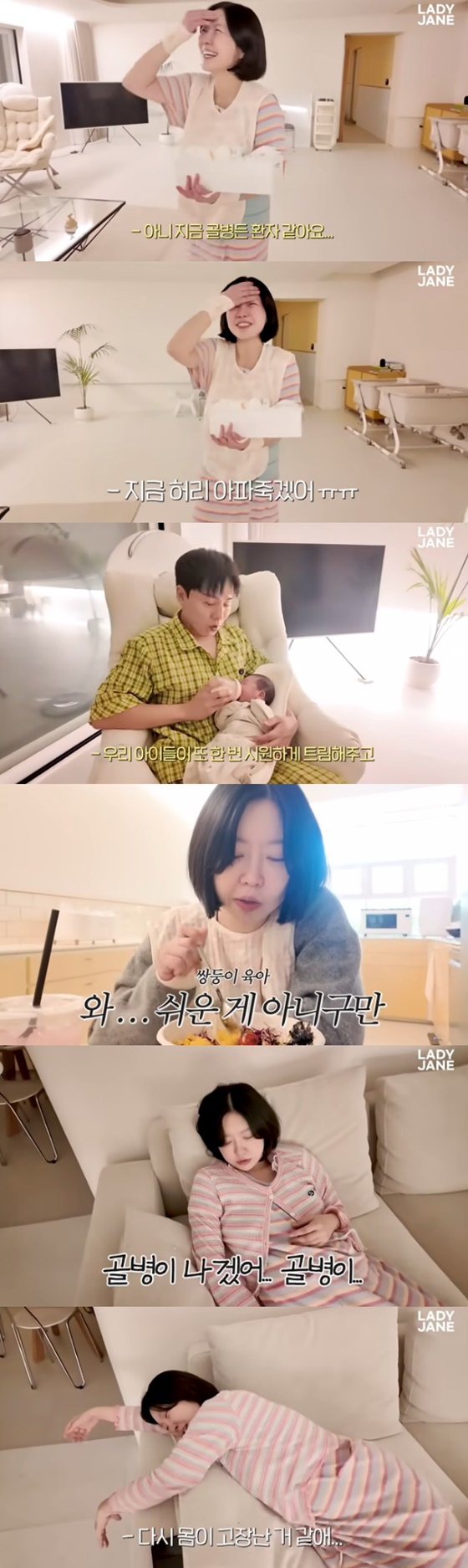 레이디제인은 "지금 허리 아파 죽겠다. 낮 12시에 집에 왔고, 지금 오후 8시 반인데 제대로 앉아서 쉰 적이 없다. 계속 기저귀 갈고 씻기고 밥 먹이고... 말하기도 힘들다"고 털어놨다.