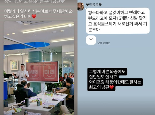 또 심진화는 집안을을 마친 후 뿌듯해하는 김원효의 메시지를 공개하며 "그렇게 바쁜 와중에도 집안일도 잘하고 와이프랑 태풍이에게도 잘하는 최고의 남편"이라며 애정을 드러냈다.