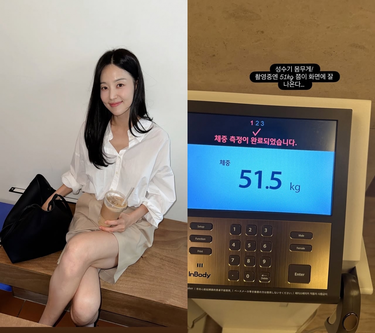 공개된 사진 속에는 체중계에 찍힌 한지혜의 몸무게 '51.5kg'가 담겨있다. 이어 한지혜는 "촬영 중엔 51kg쯤이 화면에 잘 나온다"라고 전했다.