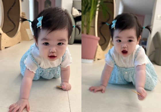 공개된 사진 속에는 딸 재이의 모습이 담겼다. 재이는 푸른색 옷과 핀을 깔 맞춤한 패션을 선보이며 귀여움을 자아냈다. 특히 바닥을 기어 다니며 넘치는 에너지를 자랑했다.