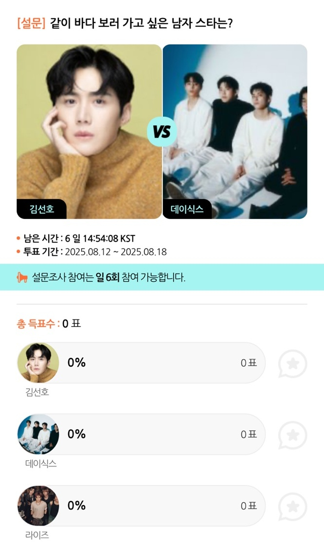 모바일 아티스트 종합 콘텐츠 앱 스타폴(STARPOLL)은 12일부터 오는 18일까지 '같이 바다 보러 가고 싶은 남자 스타는?'이라는 주제로 설문 조사를 진행한다.