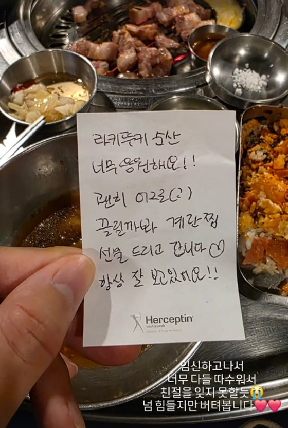쪽지에는 '라키뚜키(쌍둥이 태명) 순산 너무 응원해요!!'라는 글이 적혀 있다.