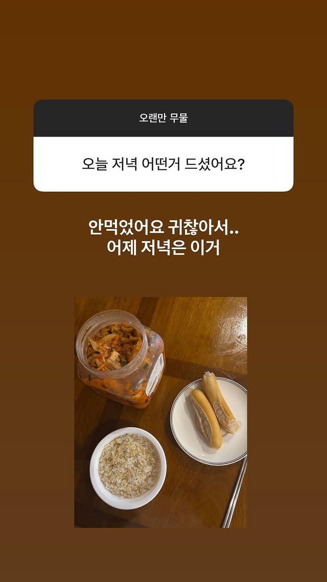 또한 이수현은 "오늘 저녁 어떤 거 드셨어요?"라는 질문에는 "안 먹었어요 귀찮아서. 어제 저녁은 이거"라며 닭가슴살 소시지와 김치, 현미밥 사진을 업로드, 자신만의 다이어트 식단을 공유했다.