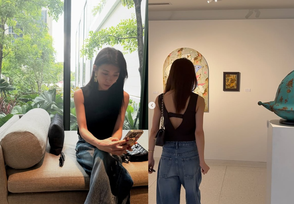공개된 사진 속 하지원은 최고급 호텔 라운지 소파에 앉아 휴대전화를 보고 있다.