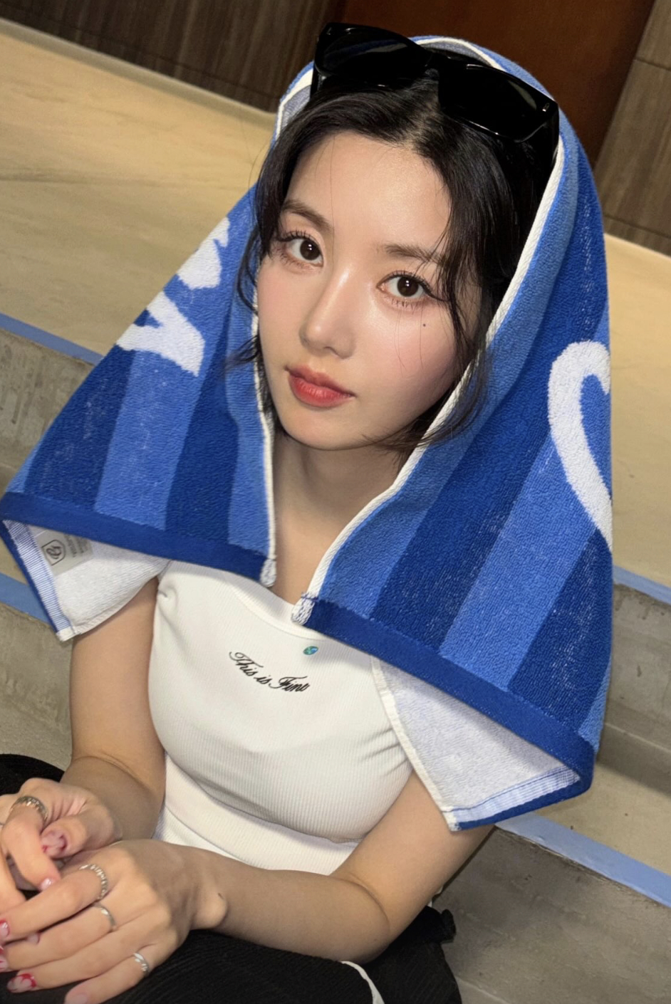 세 번째 컷에서는 파란색 수건 재질의 응원 아이템을 머리에 걸친 채 고양이를 연상케 하는 동그란 눈으로 카메라를 응시했다.
