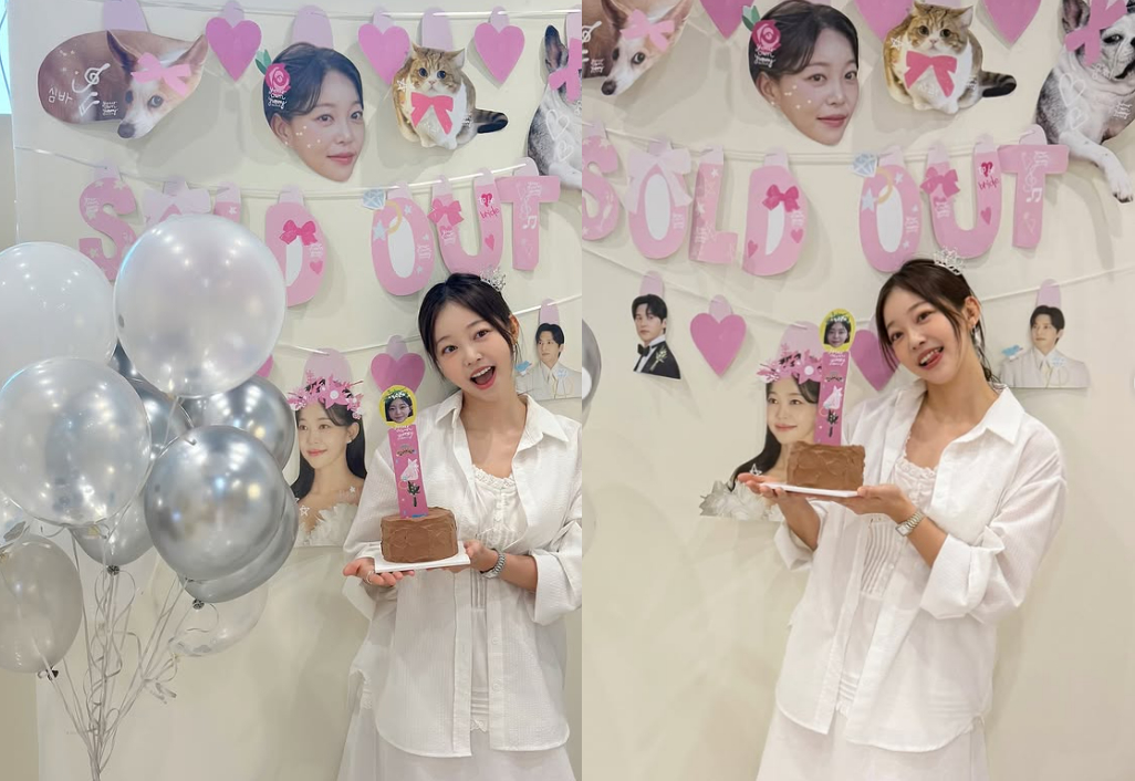 공개된 사진 속에는 오랜 친구들이 열어준 브라이덜 샤워 현장에서 환하게 웃으며 추억을 남기는 김가은의 모습이 담겼다. 한껏 꾸며진 벽에는 김가은과 윤선우는 물론 반려견, 반려묘와 함께 'SOLD OUT'이라고 적혀있다.