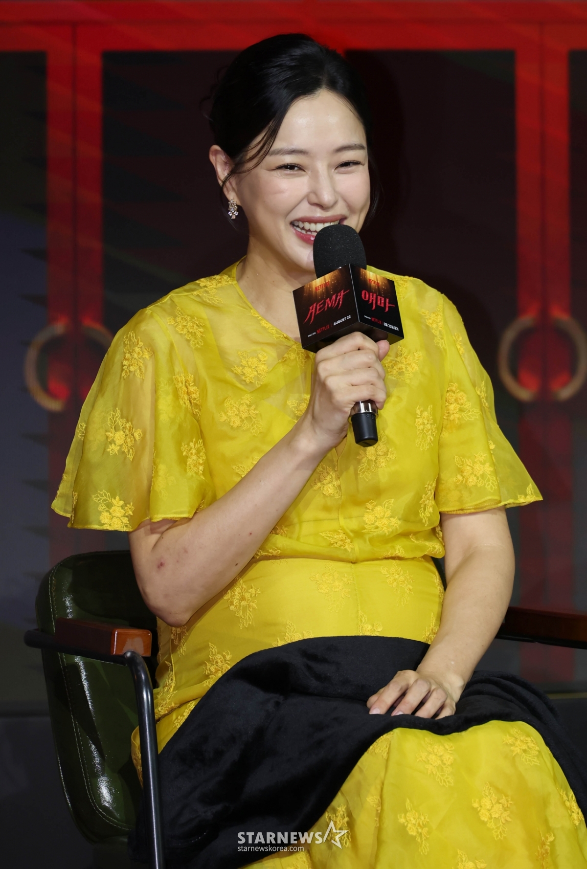 배우 이하늬가 18일 오전 서울 마포구 호텔나루 서울 엠갤러리에서 진행된 넷플릭스 오리지널 시리즈 '애마' 제작발표회에 참석해 인사말을 하고 있다.