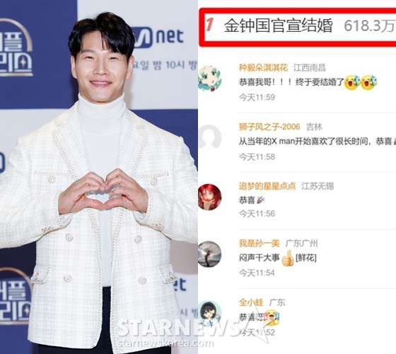 가수 김종국의 결혼 소식이 한국을 넘어 중국에서도 폭발적인 관심을 얻고 있다.