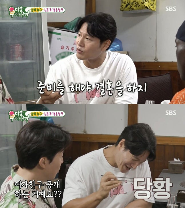 이에 김종국은 "그것도 맞는 얘기다. 준비해야지. 집이 없으면 어떻게 하냐"라고 답해 자신의 '결혼설'에 더 불을 지폈다. 이어 "여자친구 공개하는 거냐"라는 허경환의 말에 김종국은 당황하는 모습을 보였고, "사람이 준비를 해야 결혼을 하지"라며 상황을 수습하려고 했다.