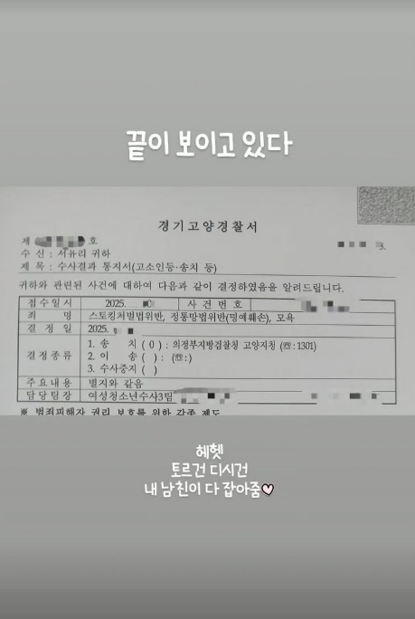 서유리는 경기 고양경찰서에서 자신에게 보낸 악플러 수사결과 통지서를 공개했다. 서유리가 스토킹처벌법위반, 정통망법위반(명예훼손), 모욕죄로 고소했던 이의 사건은 의정부지방검찰청 고양지청에 송치됐다.