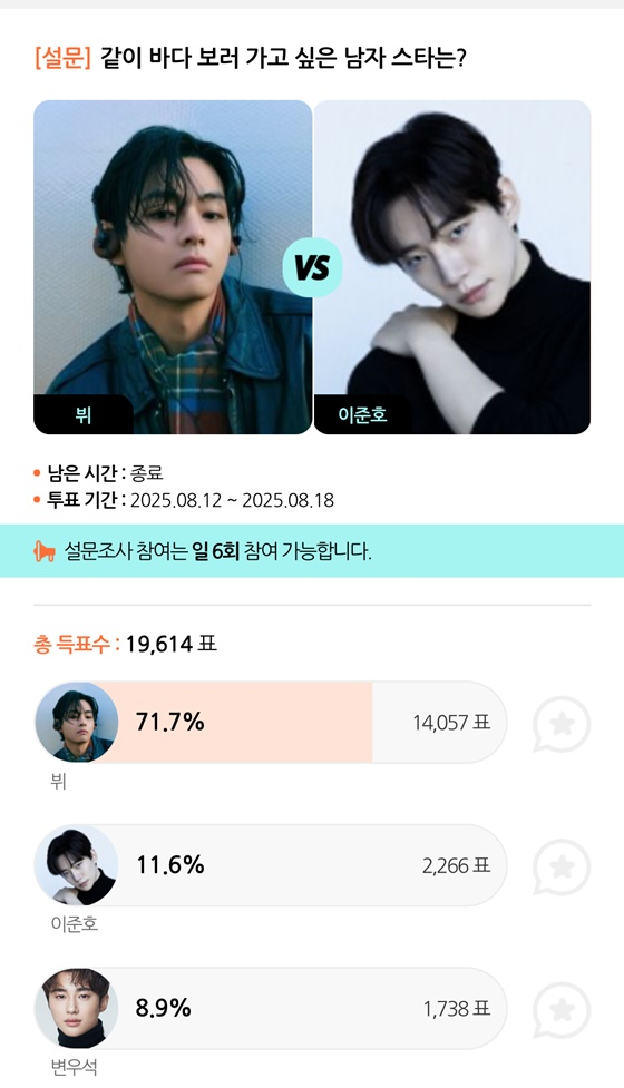 뷔는 지난 12일부터 18일까지 종합 엔터테인먼트 모바일 앱 스타폴(STARPOLL)에서 진행된 '같이 바다 보러 가고 싶은 남자 스타는?' 설문에서 1위를 차지했다.