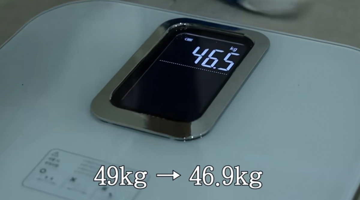 11일간의 실천을 마친 윤은혜는 체중계에 올랐고 49kg에서 46.9kg으로 2.1kg을 감량했다.