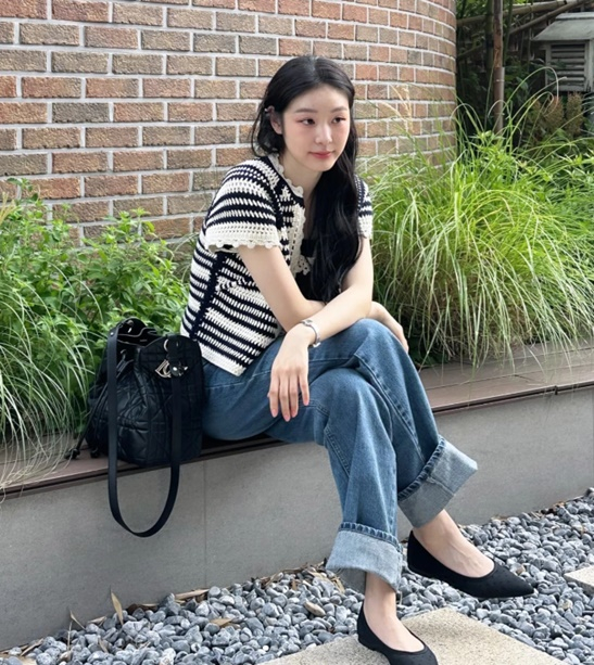 공개된 사진 속 김연아는 청바지에 스트라이프 크로쉐 상의를 매치하고 포즈를 취하고 있다. 백옥 같이 하얀 피부와 오밀조밀 예쁜 이목구비가 시선을 사로잡는다.
