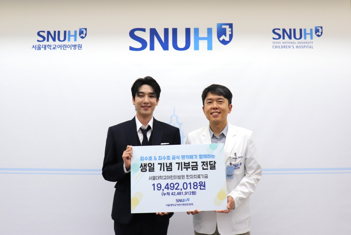 앞서 최수호와 팬클럽은 지난해에도 서울대학교어린이병원에 기부금 2298만 9894원을 전달한 바 있다. 2년간 누적 기부금은 4248만 1912원에 이른다.