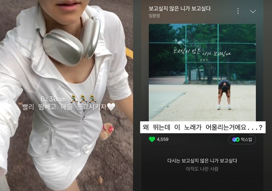 또한 서하얀은 또 다른 게시글을 올리고 러닝 중 듣고 있는 음악을 공유했다. 이에 따르면 서하얀은 임창정의 '보고싶지 않은 니가 보고싶다'를 들으며 달리기를 했다.