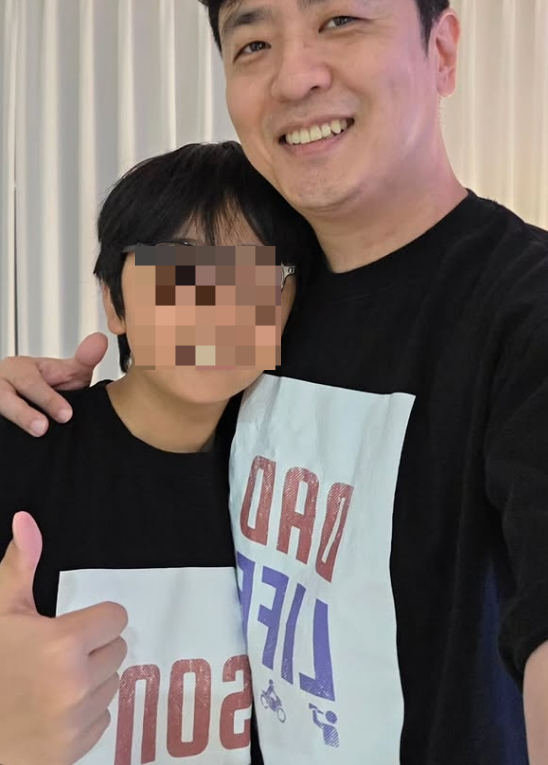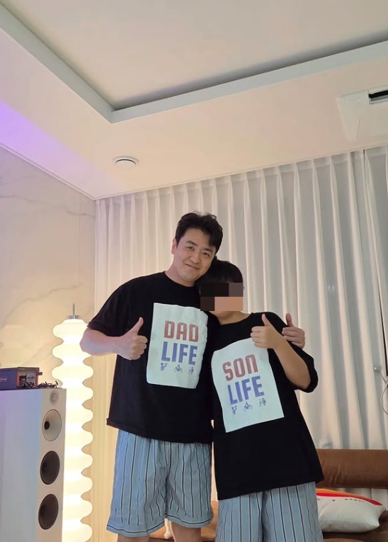 공개된 사진에는 커플 티셔츠와 잠옷 바지를 입고 다정한 포즈를 취하고 있는 최동석과 아들의 모습이 담겨 있다. 사진 속 두 사람은 어깨동무를 하고 엄지를 치켜세우며 훈훈한 부자 지간의 모습을 보여줬다.