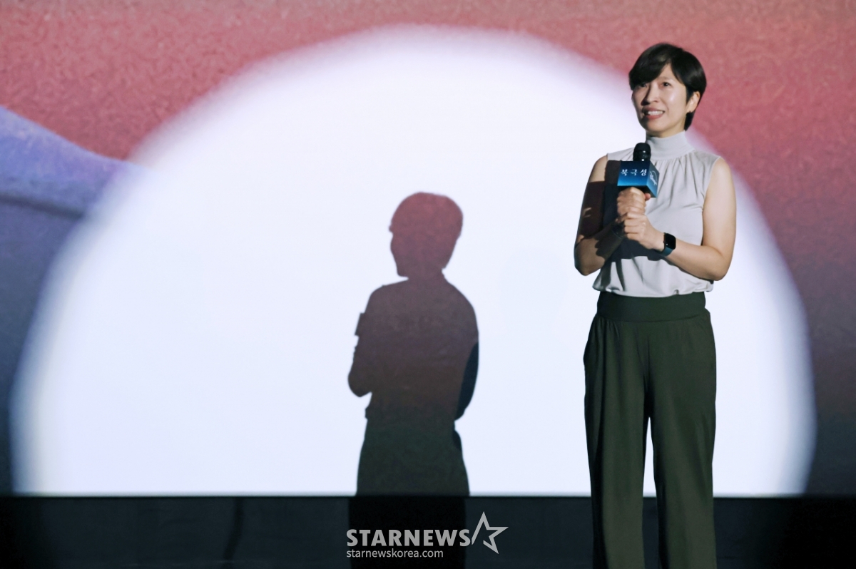 정서경 작가가 20일 오후 서울 CGV용산아이파크몰에서 진행된 디즈니+ 오리지널 시리즈 '북극성' 크리에이터스 토크 행사에 참석해 작품설명을 하고 있다.