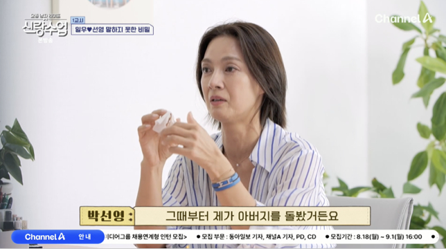 개인 상담에서 아버지에 대한 질문을 받은 박선영은 "회사생활을 오래 안 했다. 이직이 많으셨다. 주로 밖에 나도셔서 아버지에 대한 정은 별로 없다"고 입을 열었다. 이어 "접촉한 시간도 없고, 자녀에 대한 살가운 것도 없고 이기적인 분이었다. 모든 걸 어머니가 해주셨다"며 차분하게 설명했다.