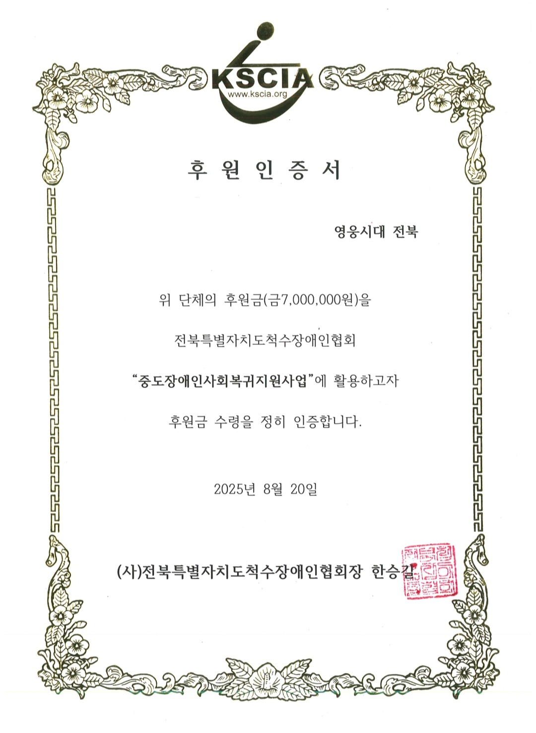 임영웅 팬클럽 영웅시대 전북방은 8월 20일 전북특별자치도척수장애인협회(회장 한승길)에 700만 원을 기부했다