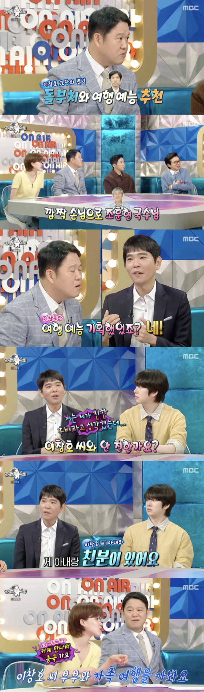 그러자 김구라는 "이창호 아내를 만나 이야기를 나눠봐야겠다"라고 농담을 던졌고, 이세돌은 "제 아내랑 이창호 씨 아내와 친분이 있다"라고 밝혔다. 이에 김구라는 두 집안이 함께하는 가족 여행을 제안했고, 장도연은 "중국에 가서 커제를 만나라"라고 부추기며 분위기를 달궜다.